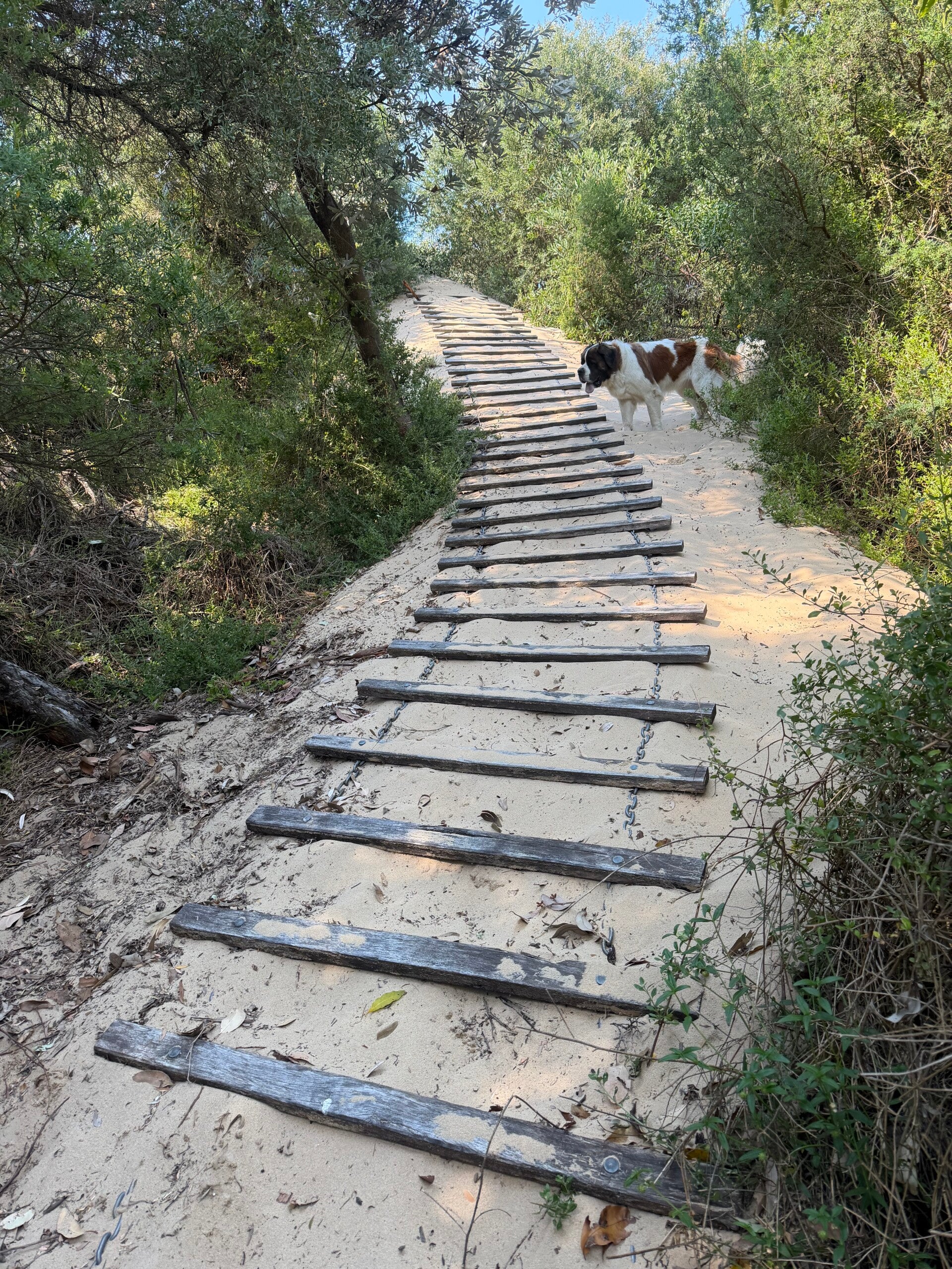 first half…. not to bad ….there is some stairs/chain ladder steps- second half… 90 degree angle, knee deep soft sand, my sweaty self was determined so I started crawling! The dogs though oh my god she wants to play with us!!! Very excitedly and instantly ran towards me ( them being ahead and running DOWN this sandy cliff face towards me) in the knee deep sand and it starts pouring down on my like a fkn sandstorm at the Sahara filling my eyes, ears, shirt and everything else and I’m yelling at them stop and they are just more excited than ever at this point I figure what the hell! And flop down fully in the sand laughing 😆 I made it to the top, changed my name to sandy cheeks and took this video of stunning corringle ! Enjoy 😉