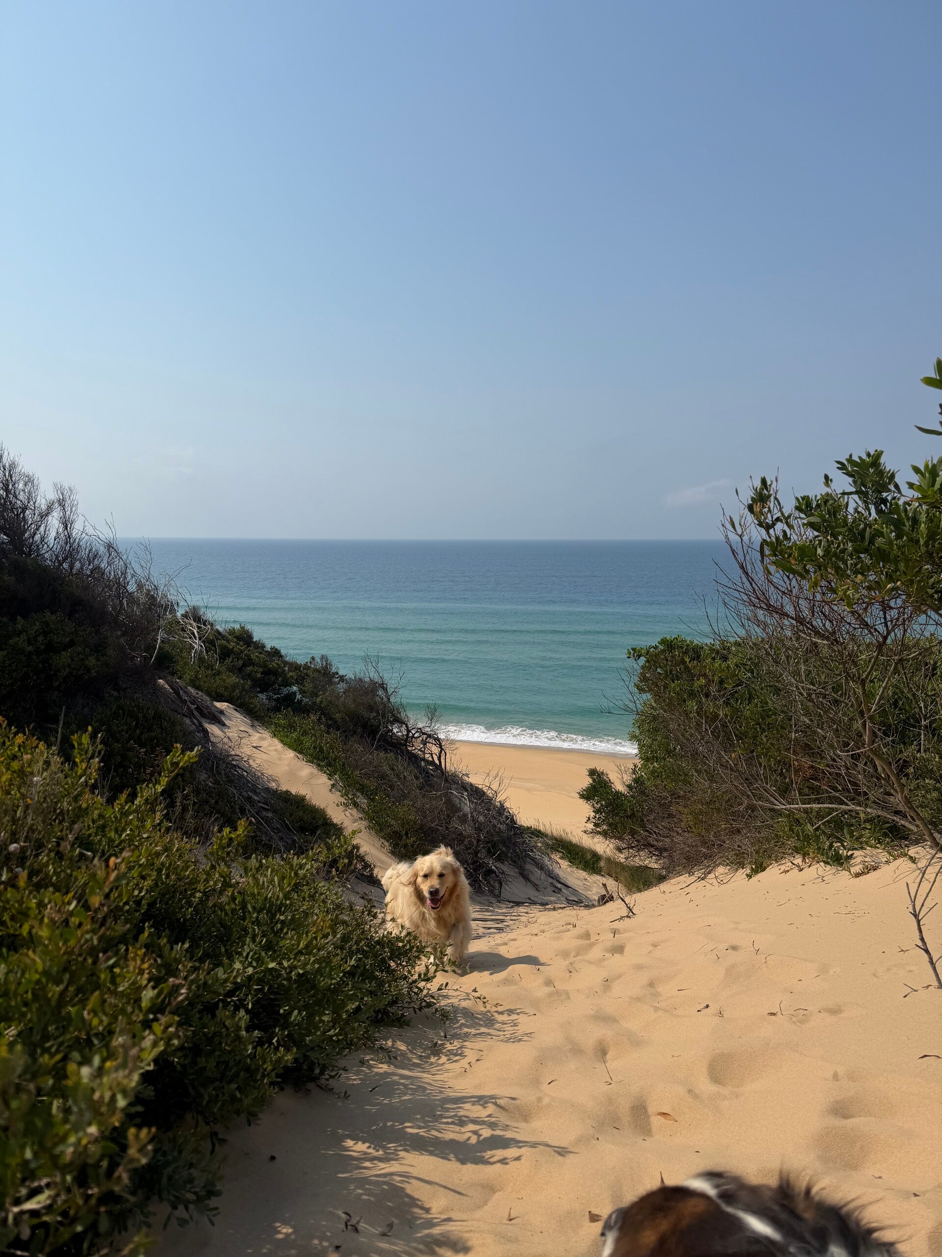 funny story - so we are heading up the sand dunes and the dogs are hypo ( it had been 24 hrs since our last walk 😱) I know outrageous! Anyway they are running ahead and play fighting and sand and shit is flying everywhere typical kind of walk only difference is we decided to climb this massive sand dune! This was one I had not conquered before and I needed a big mental health boost so I went for it!