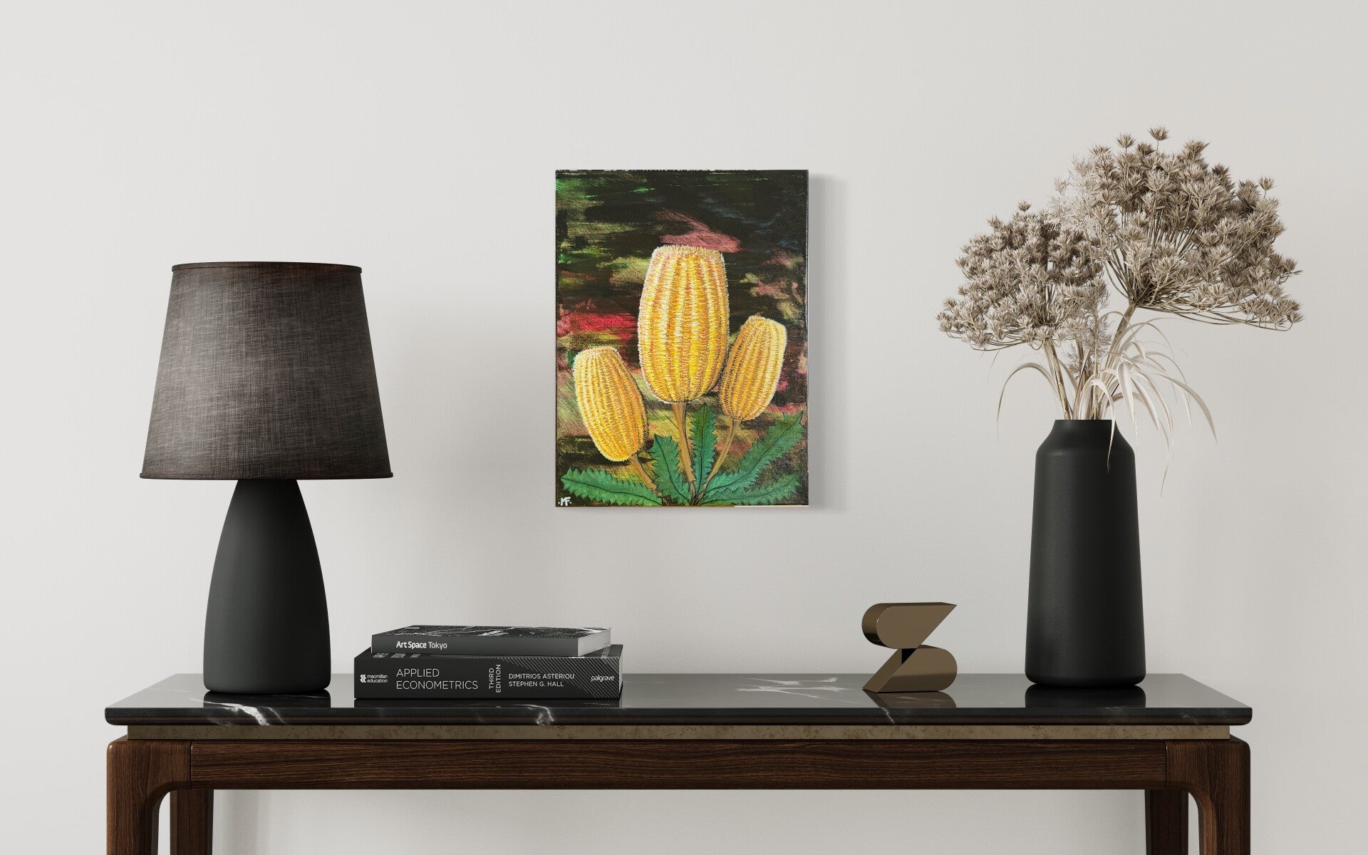 Ready to hang hand painted acrylic on canvas showcasing the beautiful coastal banksia flower 30x40cm unique one of a kind artwork by local east Gippsland artist Megan Flynn @Leafandlens