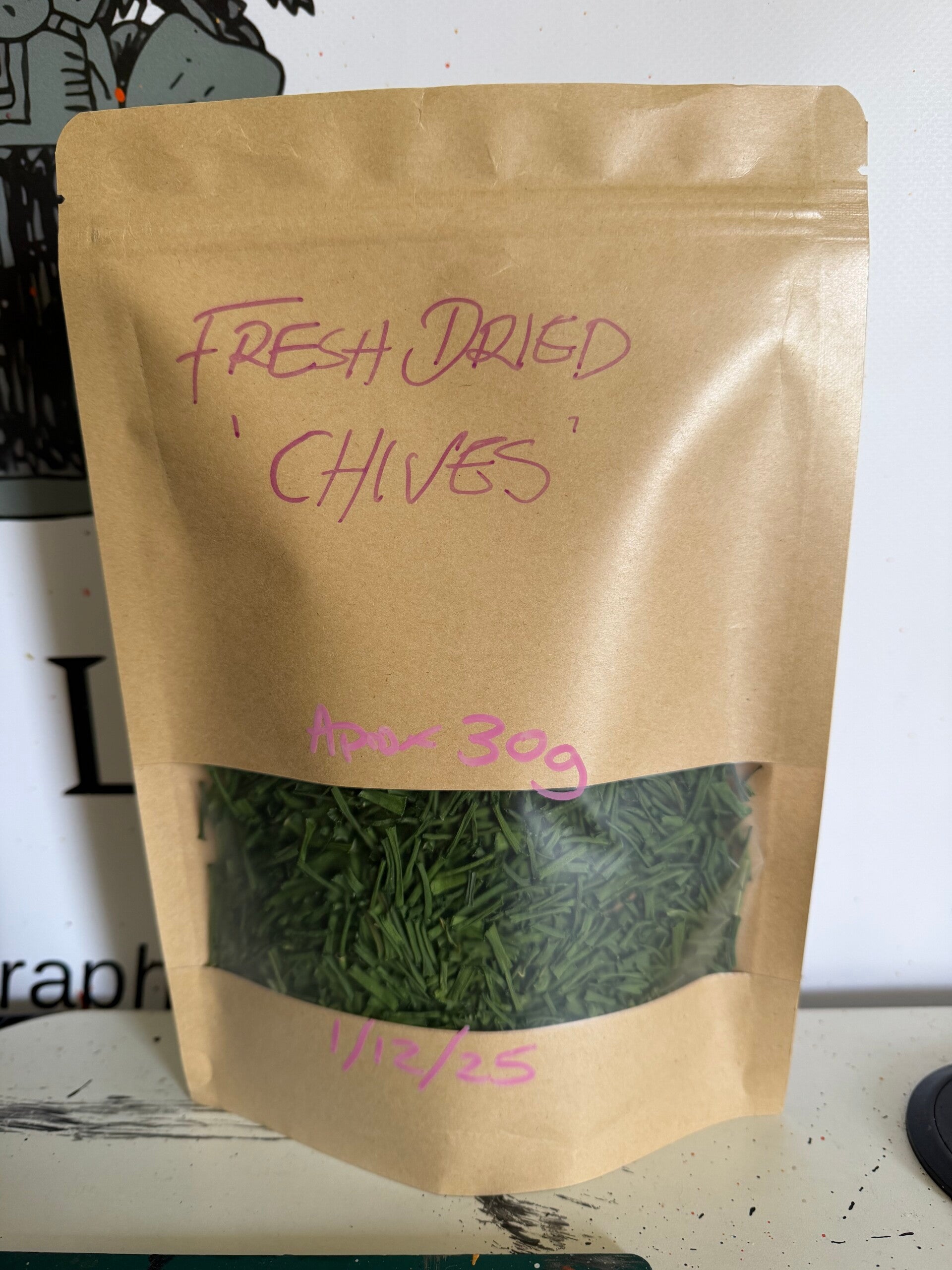 Freshly dried and loosely chopped organic chives for cooking baking and more , 30g in resealable bag for freshness.
