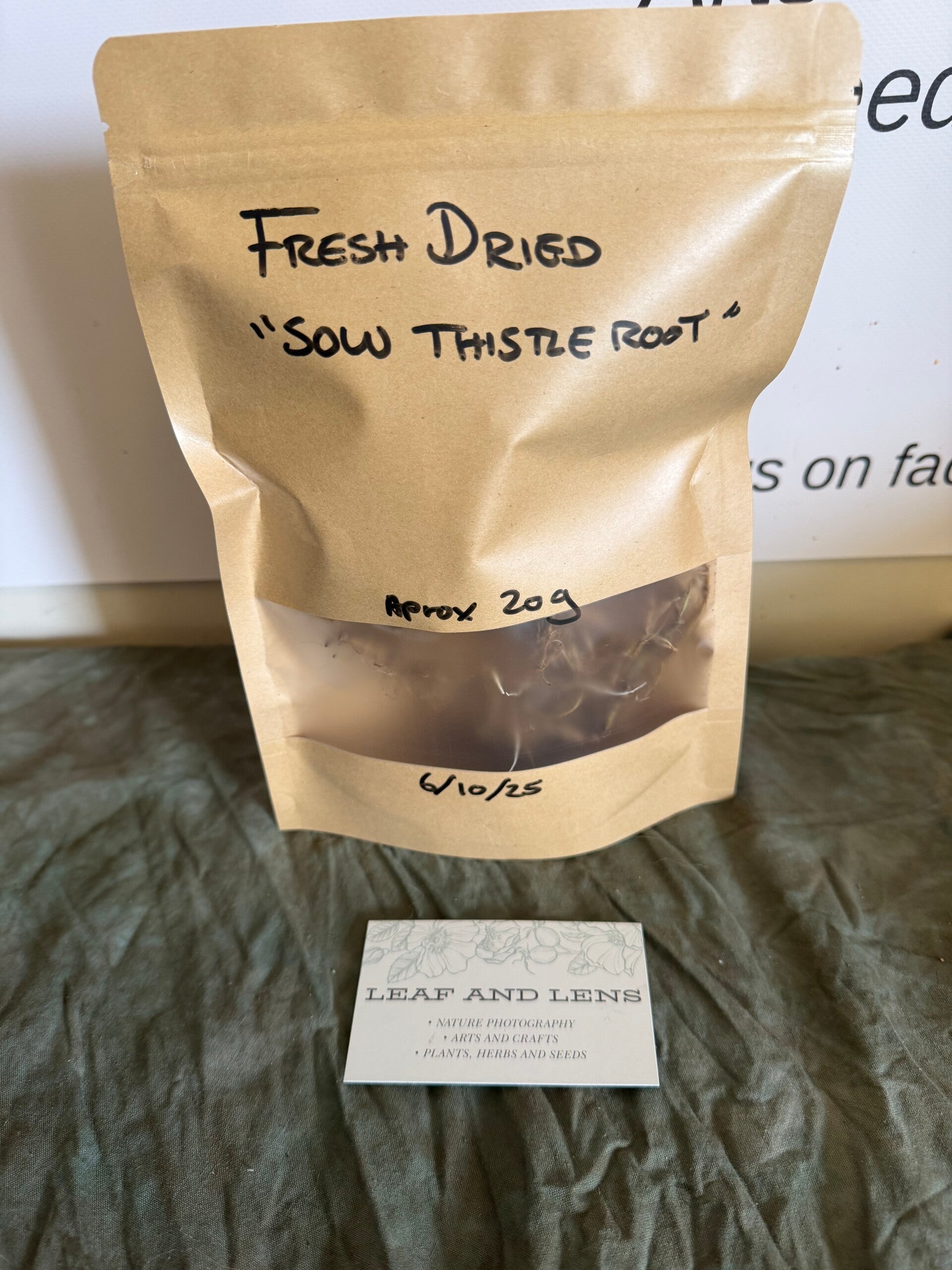 Freshly dried sow thistle root whole, organic, homegrown. 20g in resealable bag.