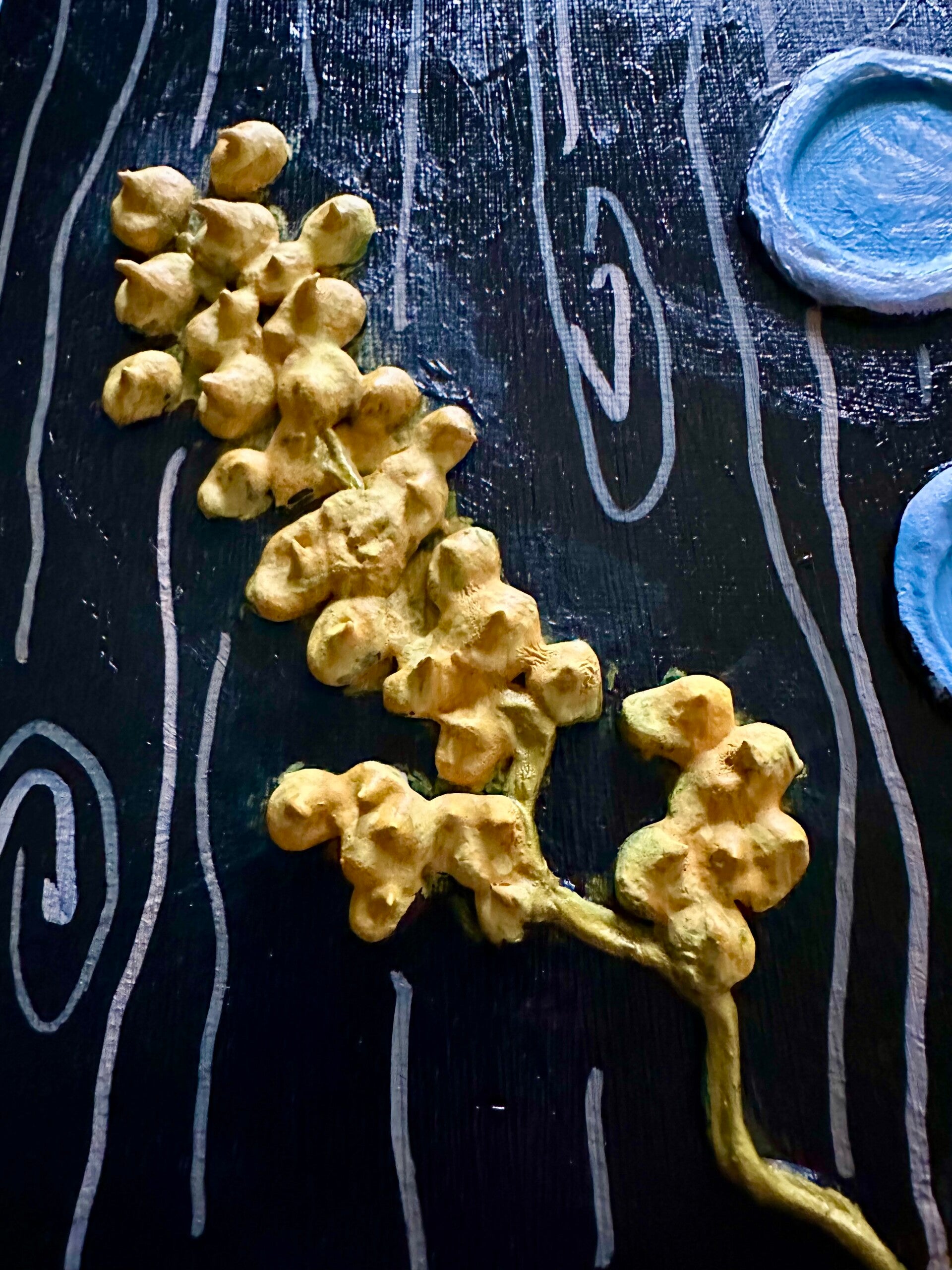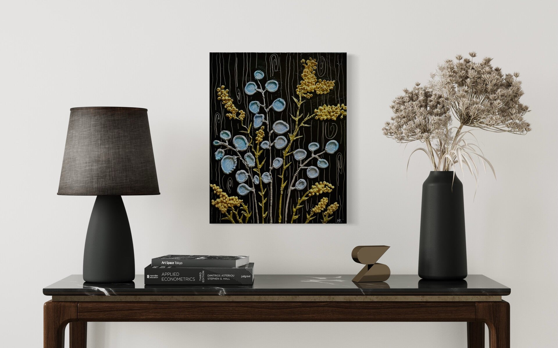 Abstract textured Aussie bouquet made up of wattle blossom and blue gum leaves. Inspired by springtime blooms in the forest, and the reminder that through darkness thing still continue to bloom. 40x50 ready to hang canvas.