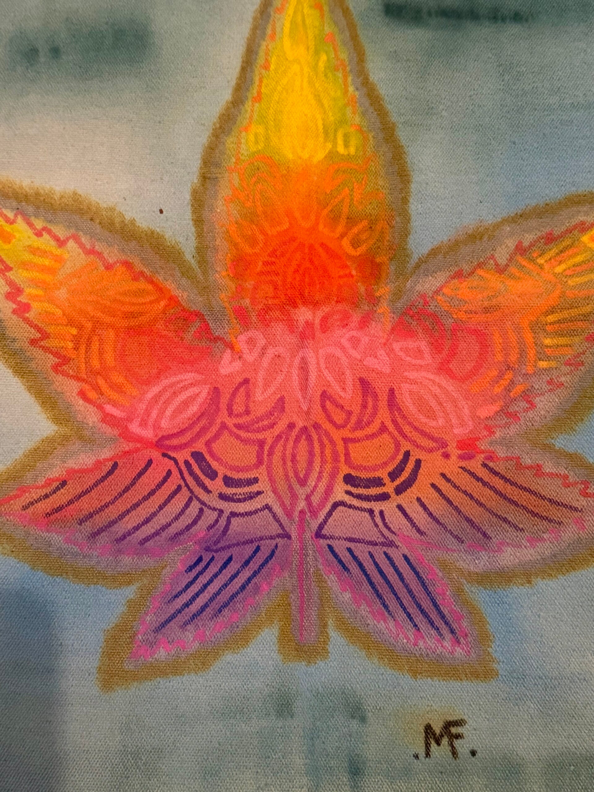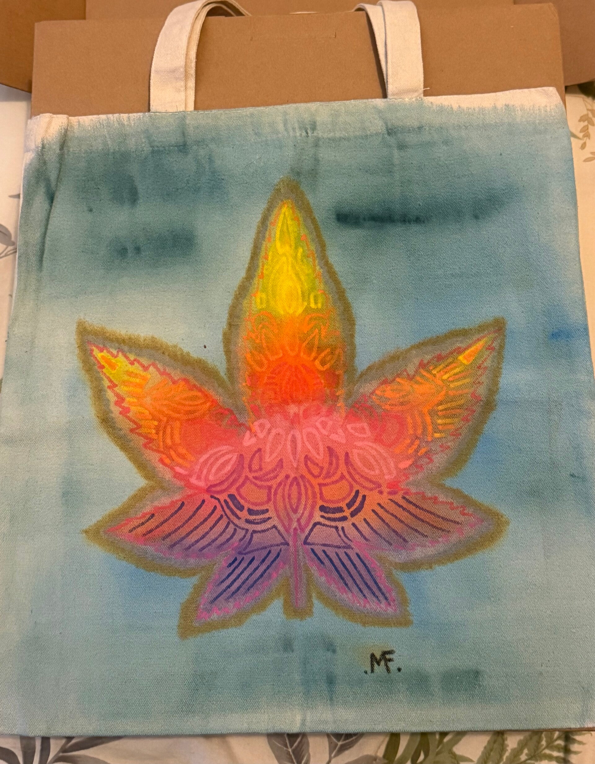 Good sized canvas tote bag hand painted with cool leaf design and vibrant colours to bring a smile to your face while your out and about or storing your favorite things !!