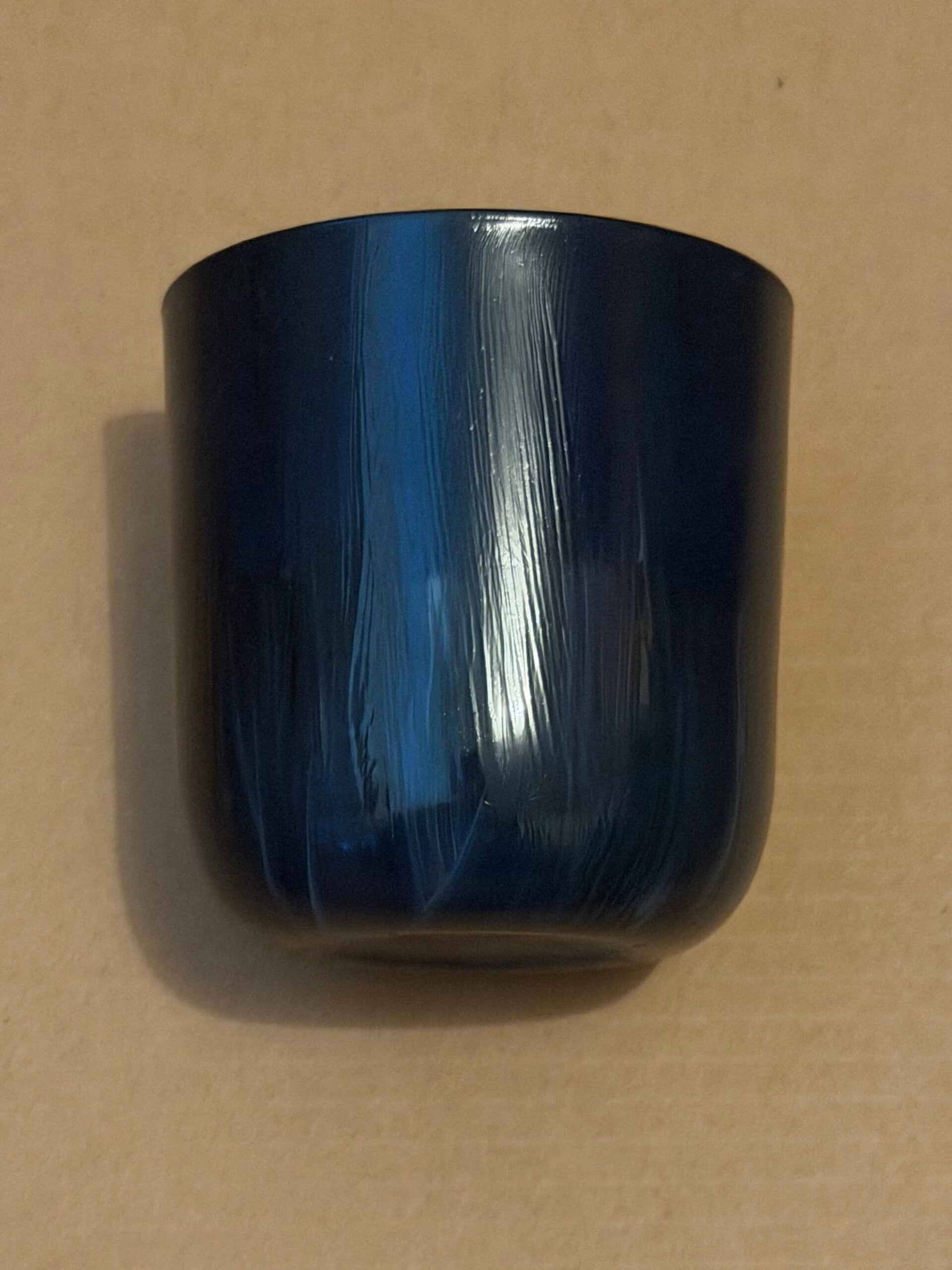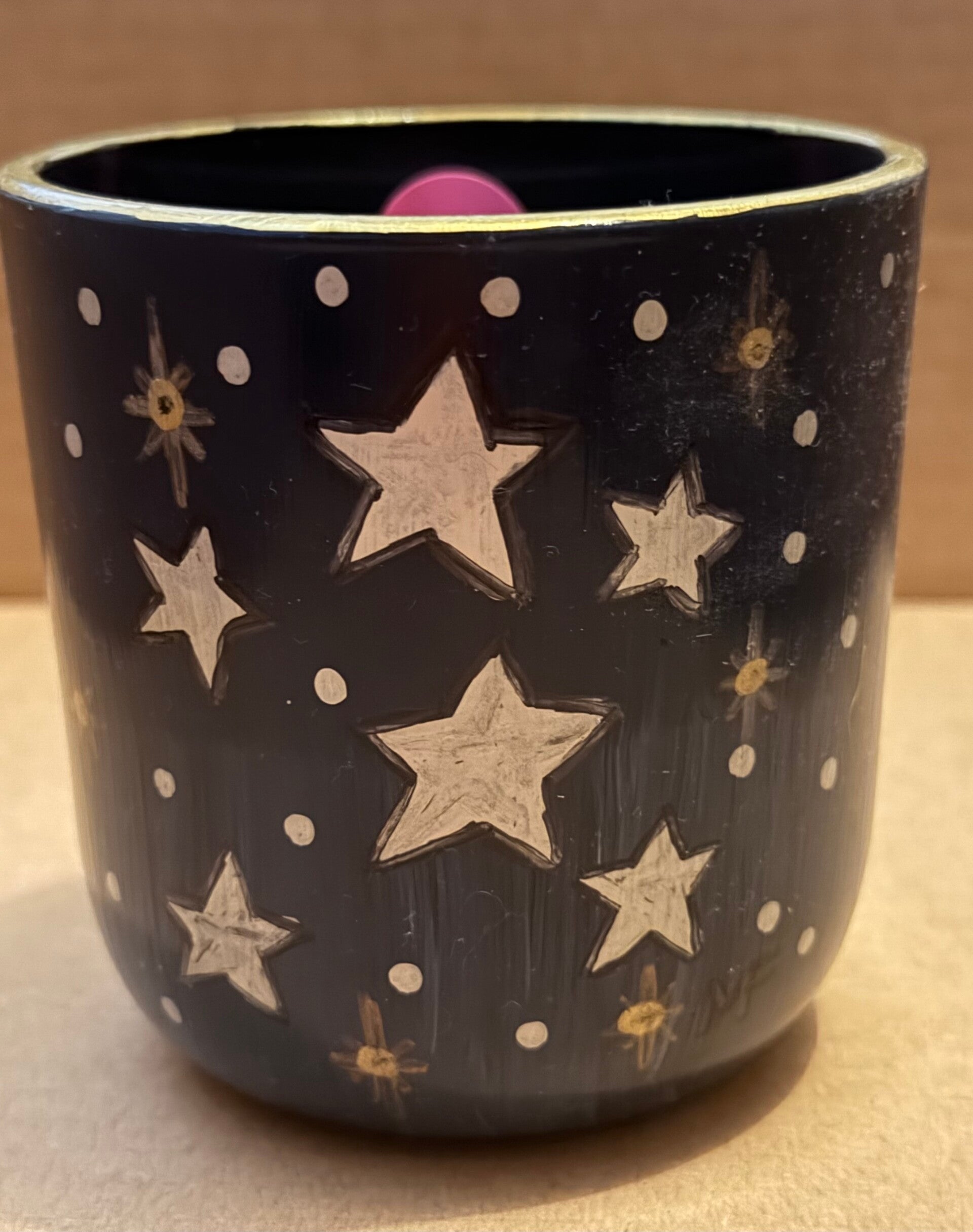Aprox 10cm glass candle holder, handpainted in a starry night sky design in deep navy gold and silver, invoke the wonder of night sky. Could also be used as a vase, pen cup, small plant pot, whatever you desire!