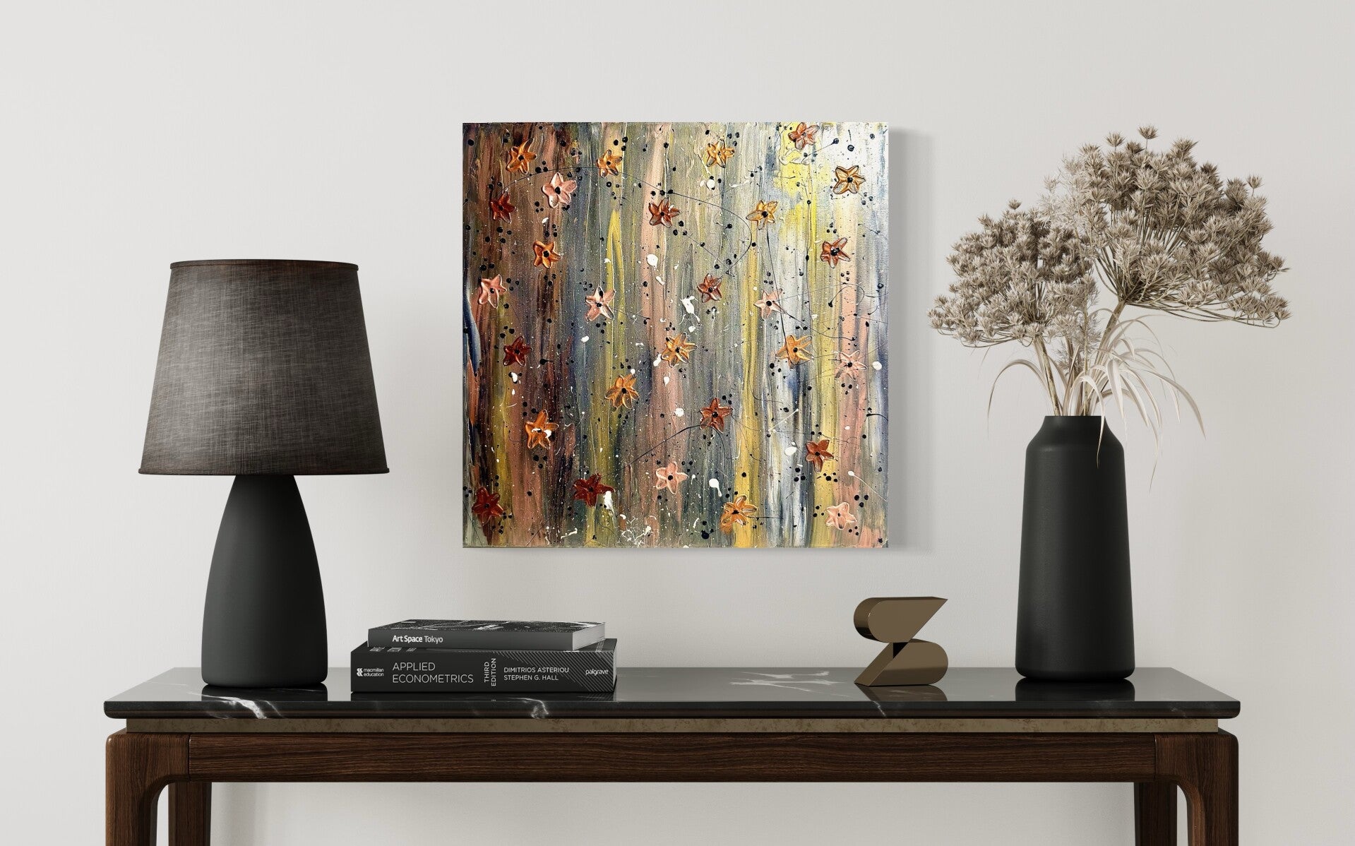 Handpainted wall art acrylic paint on canvas framed ready to hang moderns metallic colours with floral accents 51x51cm signed and sealed awaiting its new home !