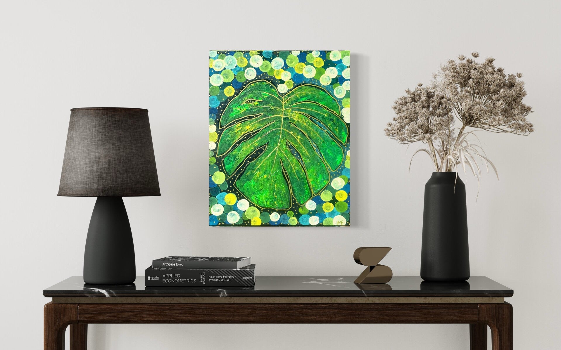 Monstera leaf printed onto canvas and details added by hand. One of a kind and ready to hang! 30x40 signed and sealed